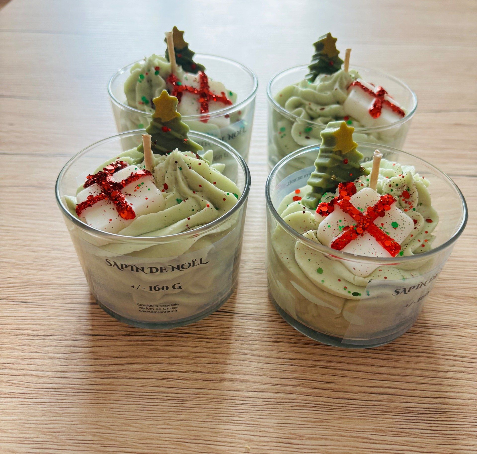 bougie décorée de son sapin de Noël, et de son joli cadeau pailleté , senteur sapin de Noël , +\- 160g de cire de soja