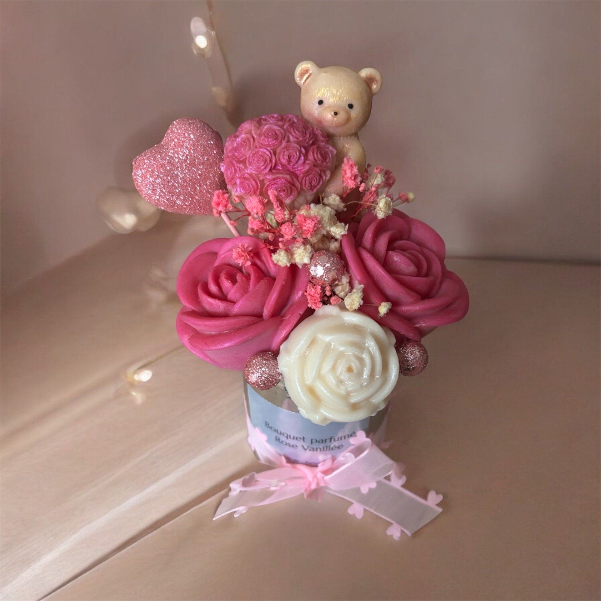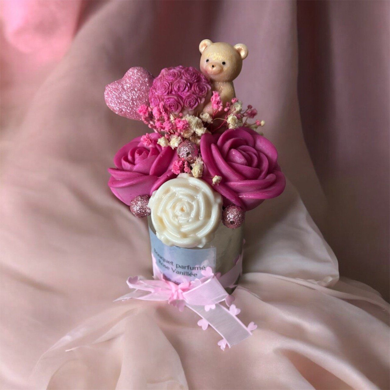 Mini bouquet ours parfumé Rose vanillée, composé de 120g de cire de soja,